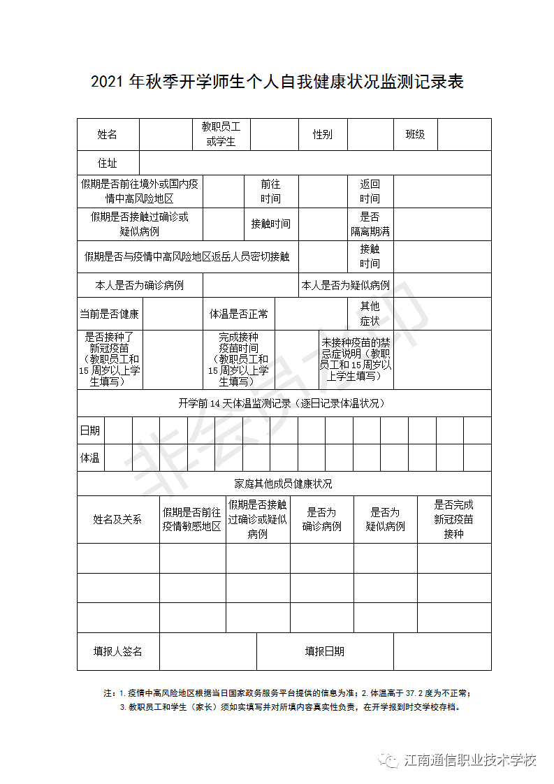 開學(xué)時(shí)請(qǐng)攜帶紙質(zhì)2021年秋季開學(xué)師生個(gè)人自我健康狀況監(jiān)測記錄表格上交學(xué)校。
