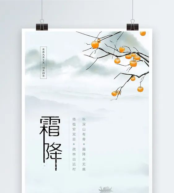 霜降二十四節(jié)氣之一,天氣漸冷,開(kāi)始有霜。霜降一般是在每年公歷的10月23日,太陽(yáng)到達(dá)黃經(jīng)210度時(shí)為二十四節(jié)氣中的霜降。霜降是秋季的最后一個(gè)節(jié)氣,是秋季到冬季的過(guò)渡節(jié)氣。秋晚地面上散熱很多,溫度驟然下降到0度以下,空氣中的水蒸氣在地面或植物上直接凝結(jié)形成細(xì)微的冰針,有的成為六角形的霜花,色白且結(jié)構(gòu)疏松。